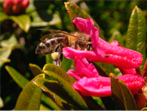 Le rhododendron est une plante mellifère que nous trouvons dans nos Alpes suisses, surtout entre 1400 et 2500 m. On en trouve deux variétés qui sont non-toxiques: le rhododendron cilié (r. hirsutum) et le rhododendron ferrugineux (r. ferrugineum). Le rhododendron ponticum qui est originaire d’Europe méditerranéenne et d’Asie du sud-ouest est quant-à-lui une variété toxique pour l’homme.