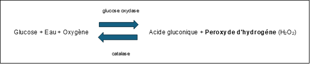 La glucose oxydase est une enzyme secrétée par les glandes hypopharyngiennes de l’abeille et naturellement présente dans le miel. Elle va catalyser l’oxydation du glucose pour former du peroxyde d’hydrogène et de l’acide gluconique. Dans le cas d’une guérison de plaie avec du miel, l’eau provenant des exsudats de la plaie favorisera la réaction ci-dessus avec une libération lente et régulière de peroxyde d’hydrogène qui exercera une action antiseptique prolongée sans dégradation tissulaire locale.