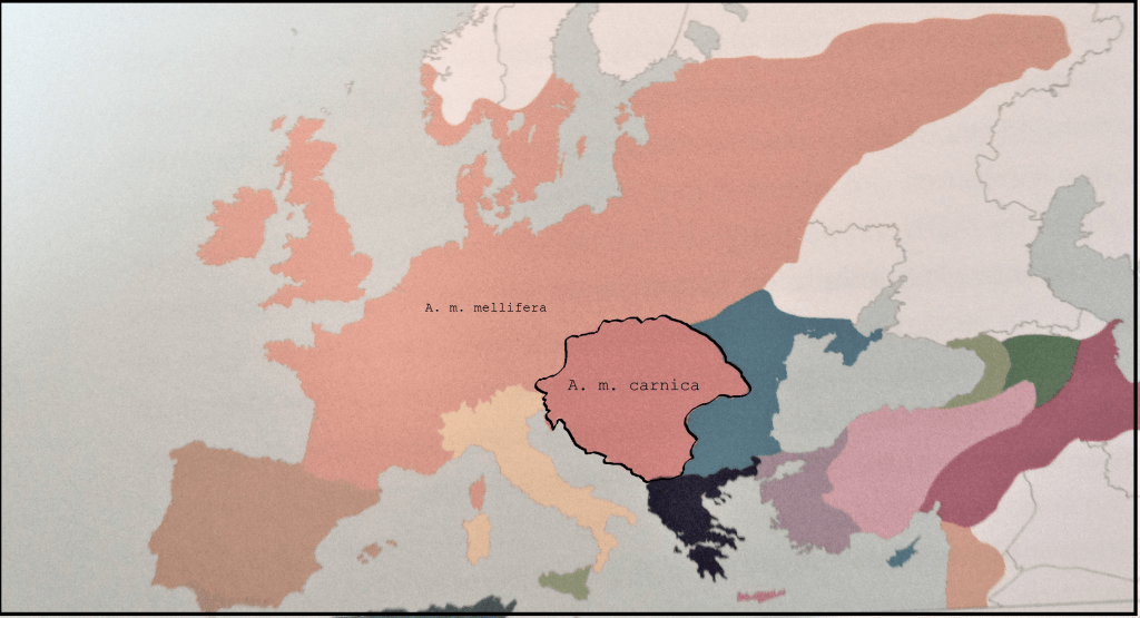 L’abeille de mes ruchers est l’Apis mellifera carnica. Elle provient d’Europe centrale (sud-est des Alpes, bassin du Danube, zone des Balkans). Elle est également connue sous le nom d’abeille carniolienne, en référence à la région de Haute-Carniole qui embrasse les reliefs des Alpes, dans le nord de la Slovénie. Dans ce pays d’Europe centrale, l’élevage et la protection de cette abeille autochtone se perpétuent depuis des siècles. Au cœur de ces contrées montagneuses la tradition apicole y est forte et c’est une composante essentielle de la culture locale (la densité d’apiculteurs en Slovénie serait l’une des plus élevées d’Europe). Un fait particulier et une coutume ancestrale ancrée dans l’histoire profonde des éleveurs d’abeilles slovènes est de peindre les frontons des ruches (permettant ainsi un repérage pour les abeilles qui arrivent à différencier les couleurs et les formes).