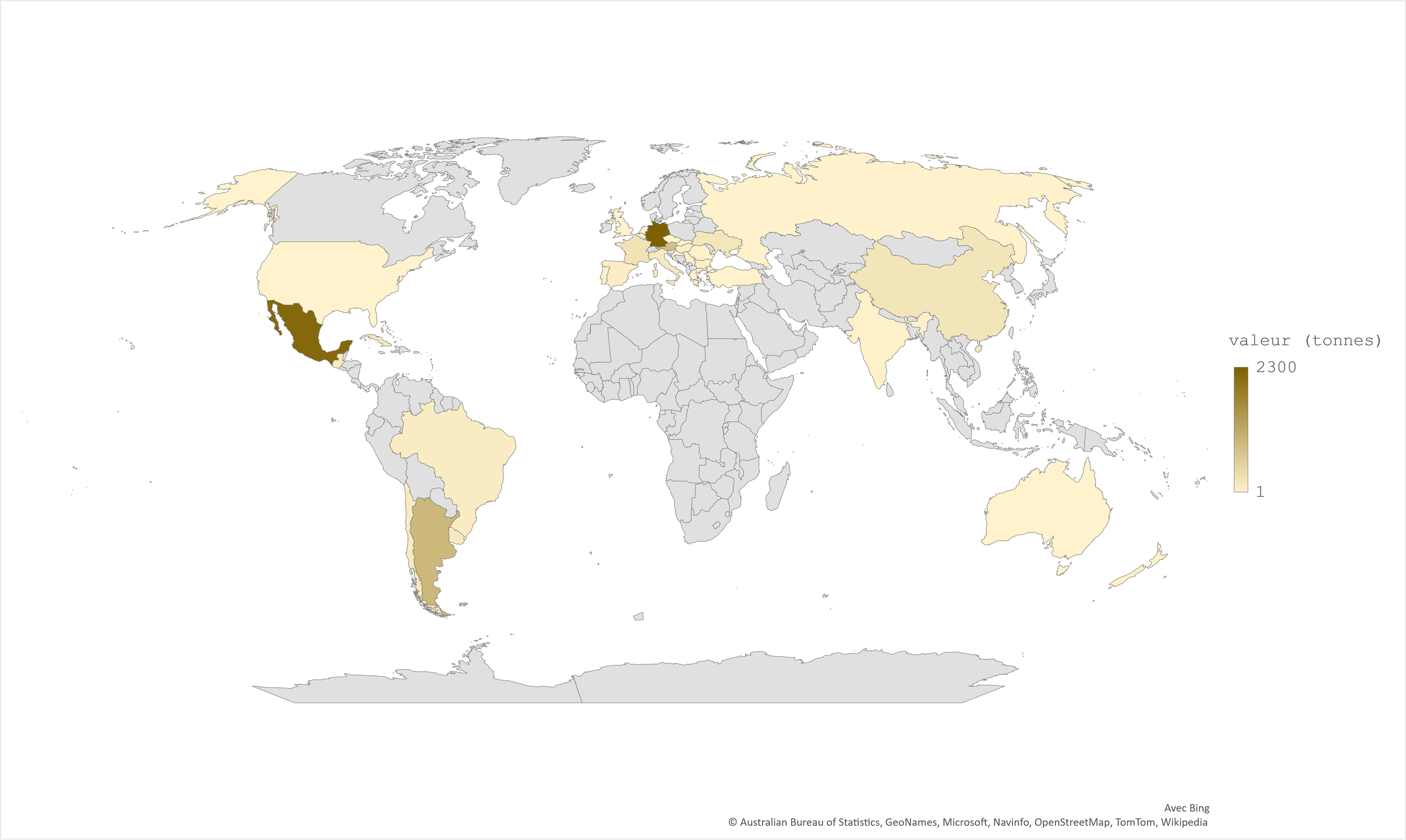 Comme le montre la cartographie mondiale ci-contre, l’origine du miel importé en Suisse provient de nombreux pays. L’Allemagne et le Mexique, avec respectivement des volumes de 2’300 et 2’170 tonnes de miels, sont les deux principaux pays d’importation (données de 2020). Le total de la production étrangère importée en 2020 s’élève à 8’097 tonnes.
