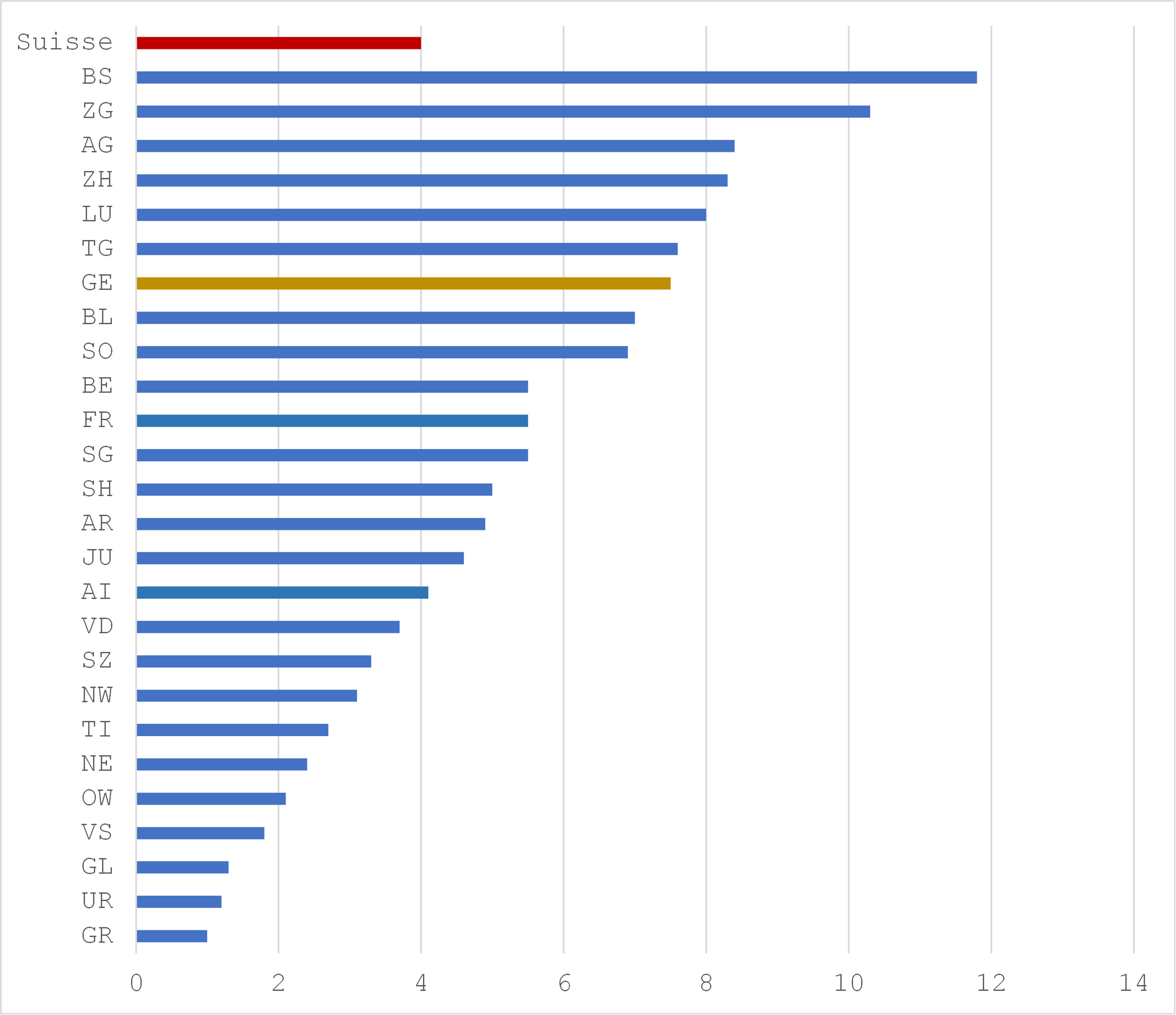 Au niveau suisse, la densité moyenne d’abeilles est de 4,0 colonies par km2 (données de 2014). Le canton de Bâle-Ville présente la densité la plus élevée, avec 11,8 colonies par km2 ; la plus faible étant dans le canton des Grisons avec 1 colonie par km2. Genève est parmi les cantons à plus forte densité avec une valeur de 7.5 colonies par km2. Nous pouvons également relever que les différentes densités de colonies correspondent approximativement à la densité de la population résidente dans