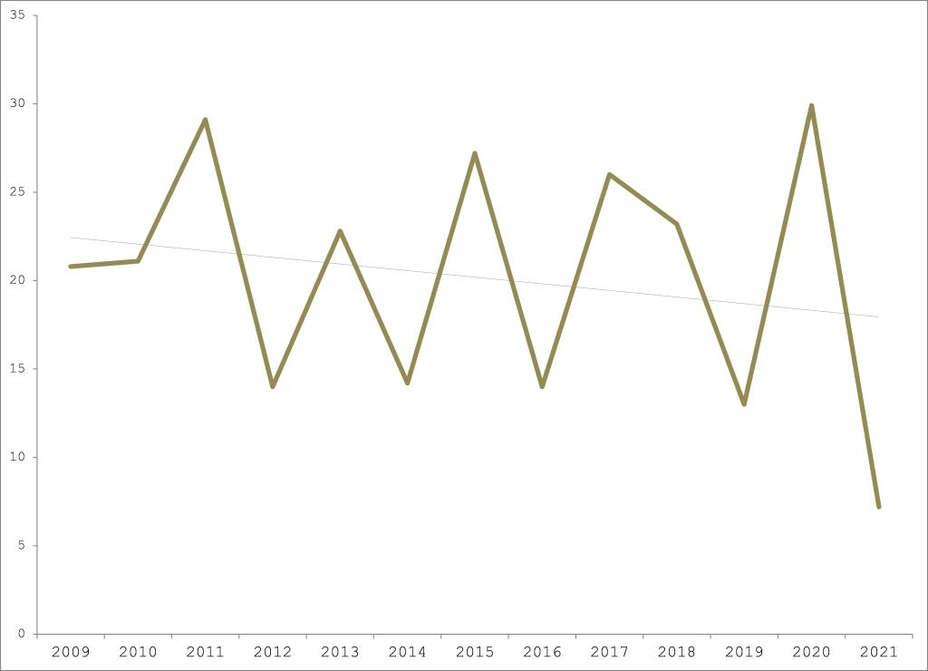 Entre 2009 et 2021, la moyenne de miel récoltée par année et par colonie se situe à 20.2 kg. Des variations relativement importantes peuvent être constatées d’une année à l’autre. En 2021, un niveau historiquement bas est enregistré avec 7.2 kg. de récolte moyenne par colonie, une baisse marquée notamment dû à des conditions météorologiques particulièrement défavorables.