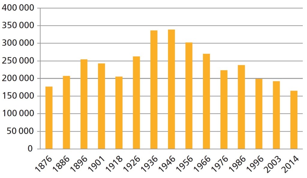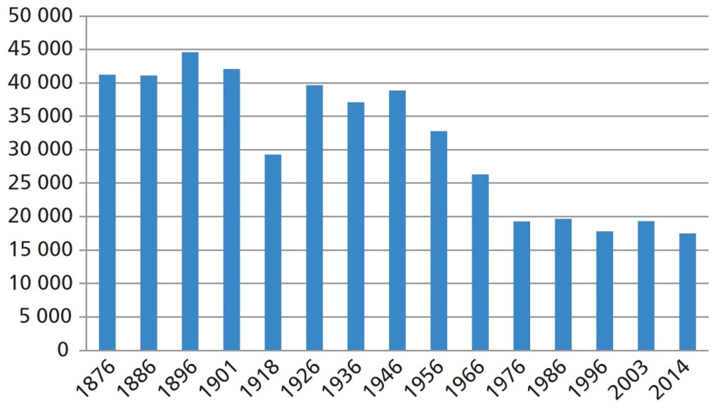 La tendance du nombre d’apiculteurs-trices, depuis plus de 140 ans, est clairement à la baisse. En 1876, le nombre d’apiculteurs-trices était plus de deux fois supérieur à celui de 2014. Malgré que cette année-là, en 2014, le nombre d’apiculteurs-trices a atteint son niveau le plus bas (17’500), le graphique nous montre une certaine stabilisation du nombre d’apiculteurs-trices à partir de 1976.